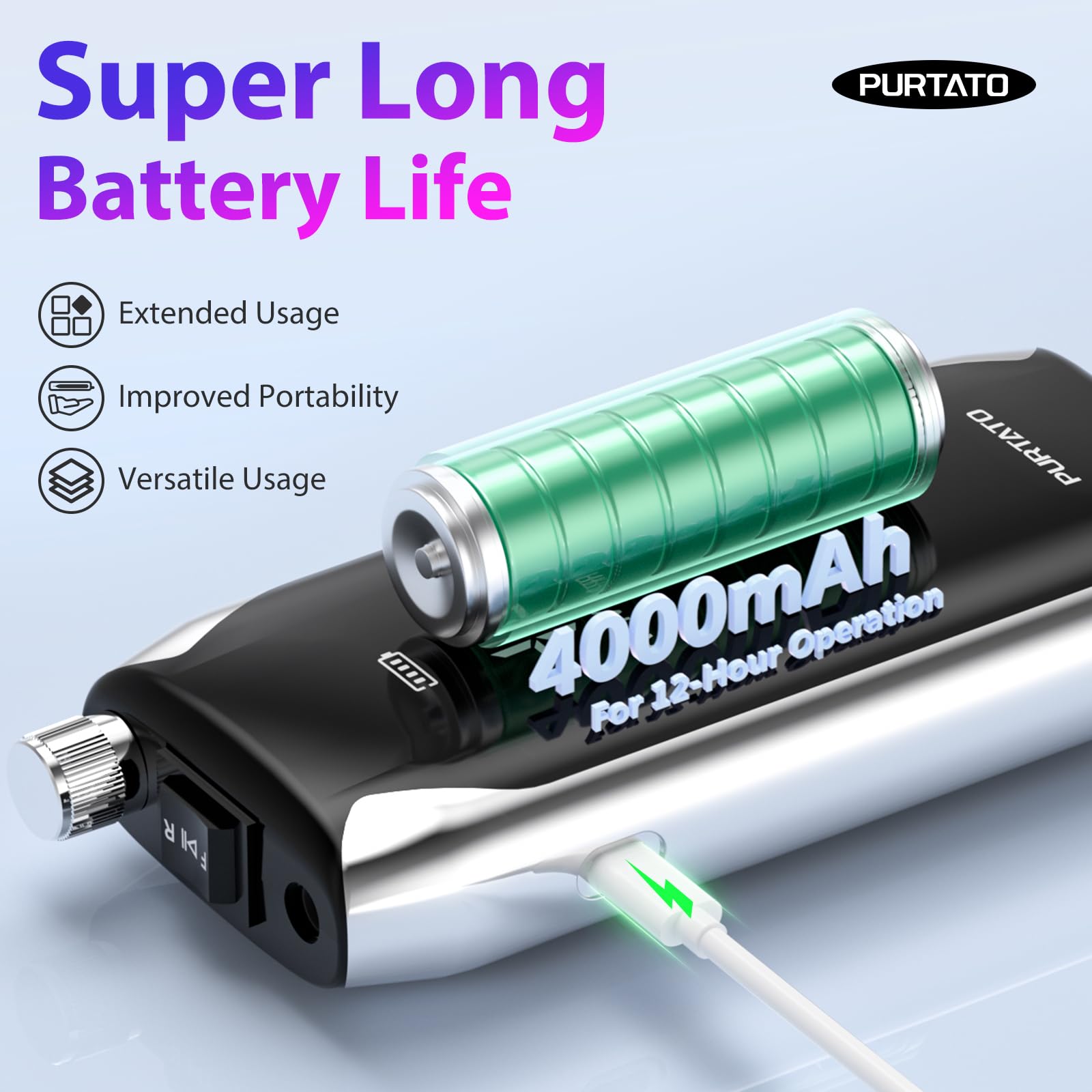 - 【Extra Long Battery Life & Low Noise】Equipped with a 4000mAh battery, this electric nail file machine can be used continuously for 12 hours, providing an efficient experience for both home users and professional manicurists. To minimize discomfort during use, the cordless nail E file with low-noise design that ensures peaceful environment while enjoying your manicure and reduces heat generation. For nail salons, greatly improve work efficiency.